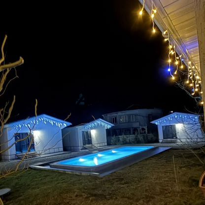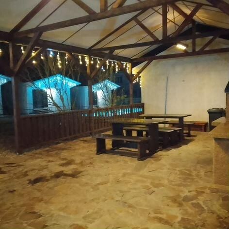 Все дома полностью меблированы диваном, двумя кроватями, прихожей, кухней с холодильником, микроволновой печью, варочной поверхностью, вытяжкой. Посуда и столовые приборы в наличии. Туалет оборудован душевой кабиной, раковиной с тумбочкой и зеркалом. Так же установлены кондиционеры с функцией обогрева, теплые полы. К каждому дому подведены коммуникации, проводной интернет, установлены вай-фай роутеры и смарт телевизоры. У каждого домика есть крытая терраса со столиком и четырьмя стульями. Для каждого гостя предусмотрен индивидуальный лежак для загара около бассейна. Так же на территории расположены бассейн 12 метров длинной и 4 шириной, оснащенный дорогим оборудованием без хлорной очистки воды и подогревом воды в холодное время года. Также на участке имеется просторная деревянная беседка площадью 60,5 м. Кв., оборудованная модульной печью барбекю из уральского камня и двумя столами с лавками, изготовленные из деревянных слэдов.